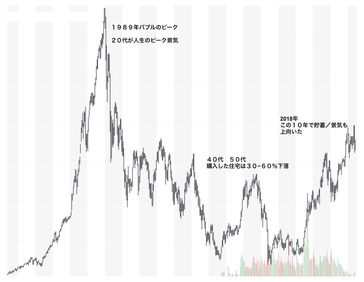 経済では1900年-1960年に世界大恐慌が発生、回復するのに約25年かかっています。図内の青丸は1980年から2018年の間に起きた二度のボトムです。