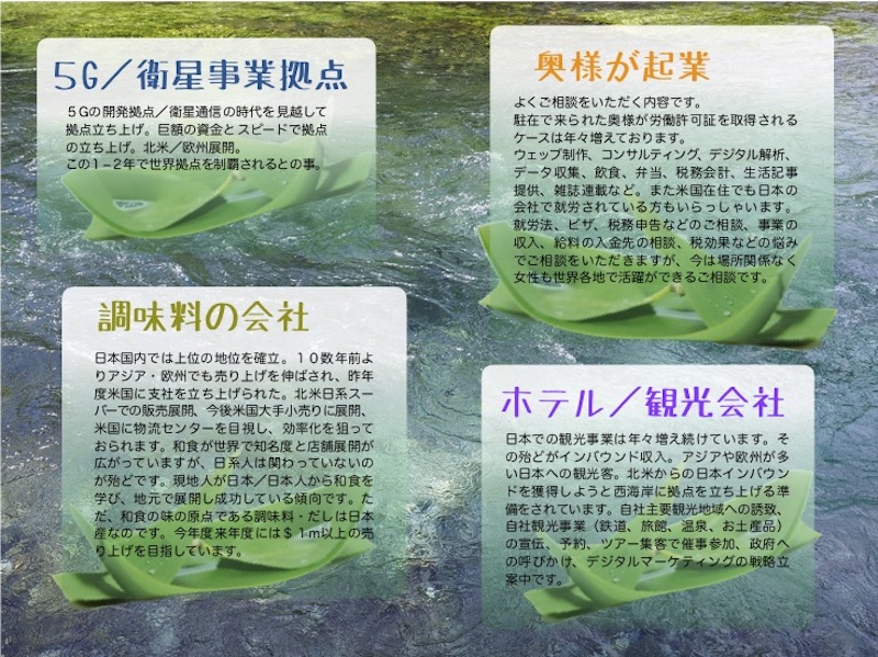 ウェッブ制作、コンサルティング、デジタル解析、データ収集、飲食、弁当、税務会計、生活記事提供、雑誌連載など。また米国在住でも日本の会社で就労されている方もいらっしゃいます。就労法、ビザ、税務申告などのご相談、事業の収入、給料の入金先の相談、税効果などの悩みでご相談をいただきますが、今は場所関係なく女性も世界各地で活躍ができるご相談です。
