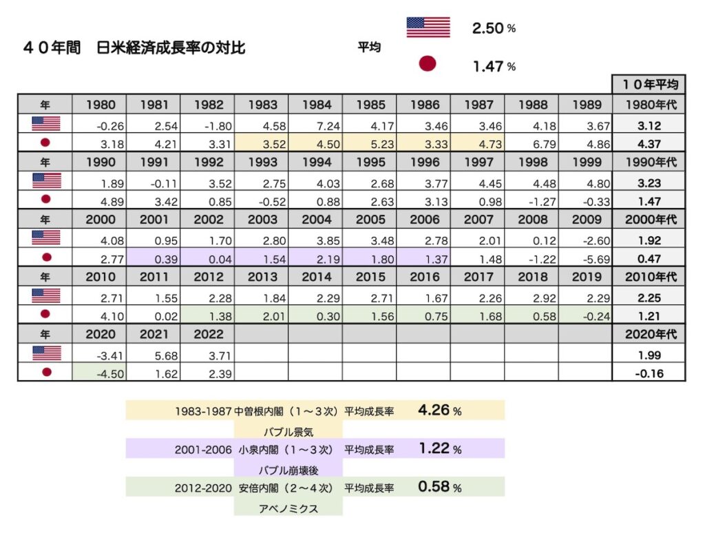1980年からの約42年間の経済成長率平均は、アメリカが2.5%、日本が1.47%と、この差が40年以上も続けば、対米国のみならず、日本の世界主要国との格差がどうなるのか見過ごせない。
